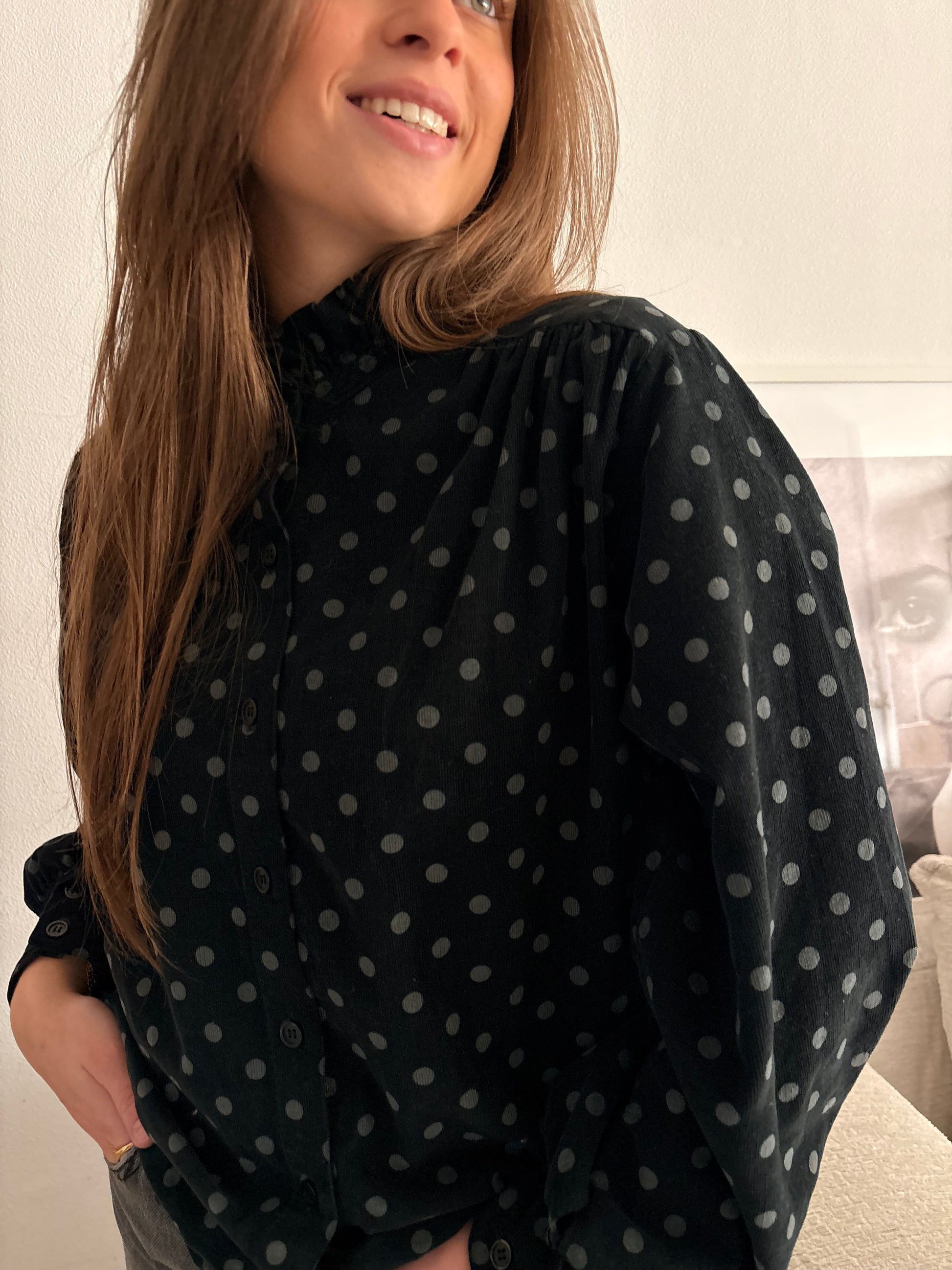 La chemise Simone en velours noir à pois gris au col volanté est parfaite pour un style élégant et décontracté.