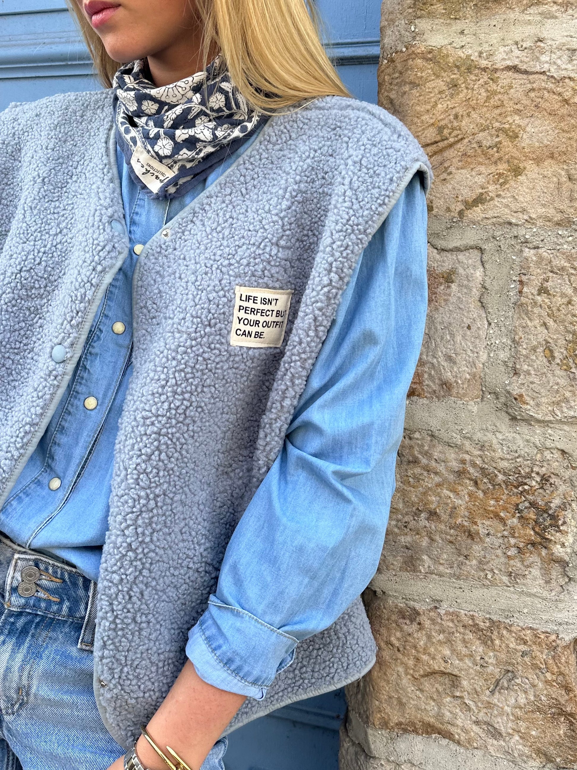 Adoptez notre gilet Gaby sans manches moumoute en coloris bleu clair avec patch sur le devant. Pour un look confort, chaleur et ultra tendance.