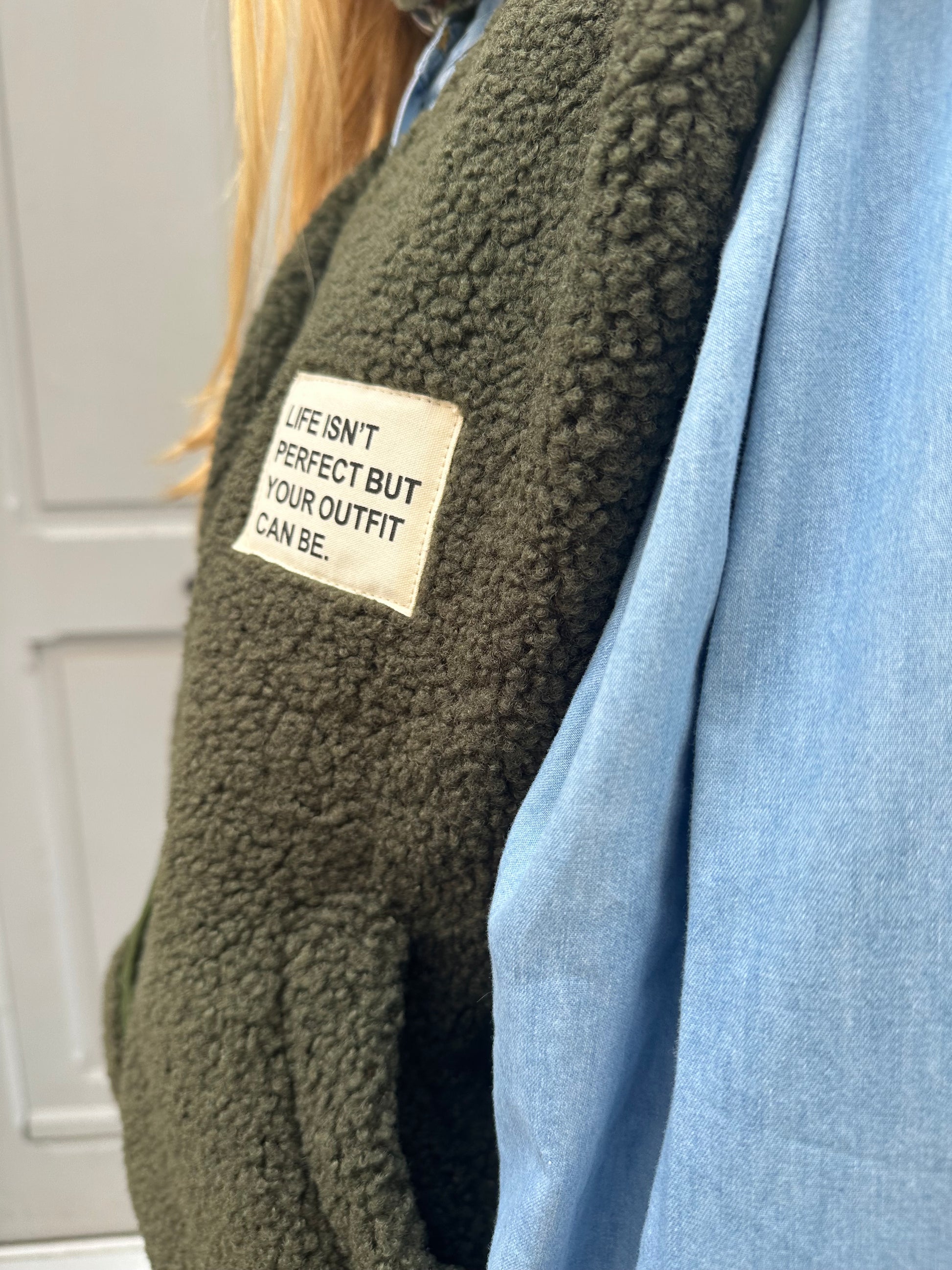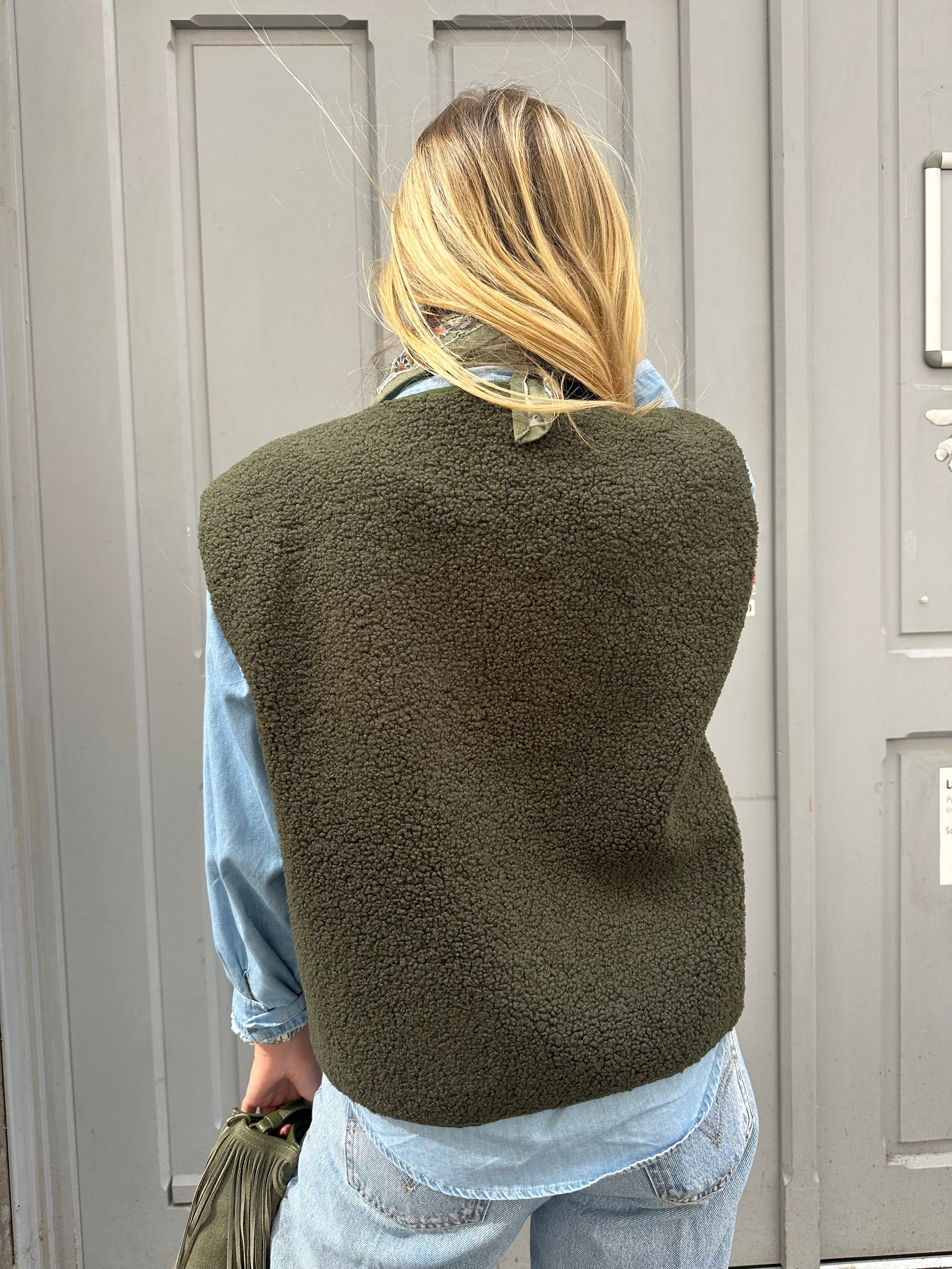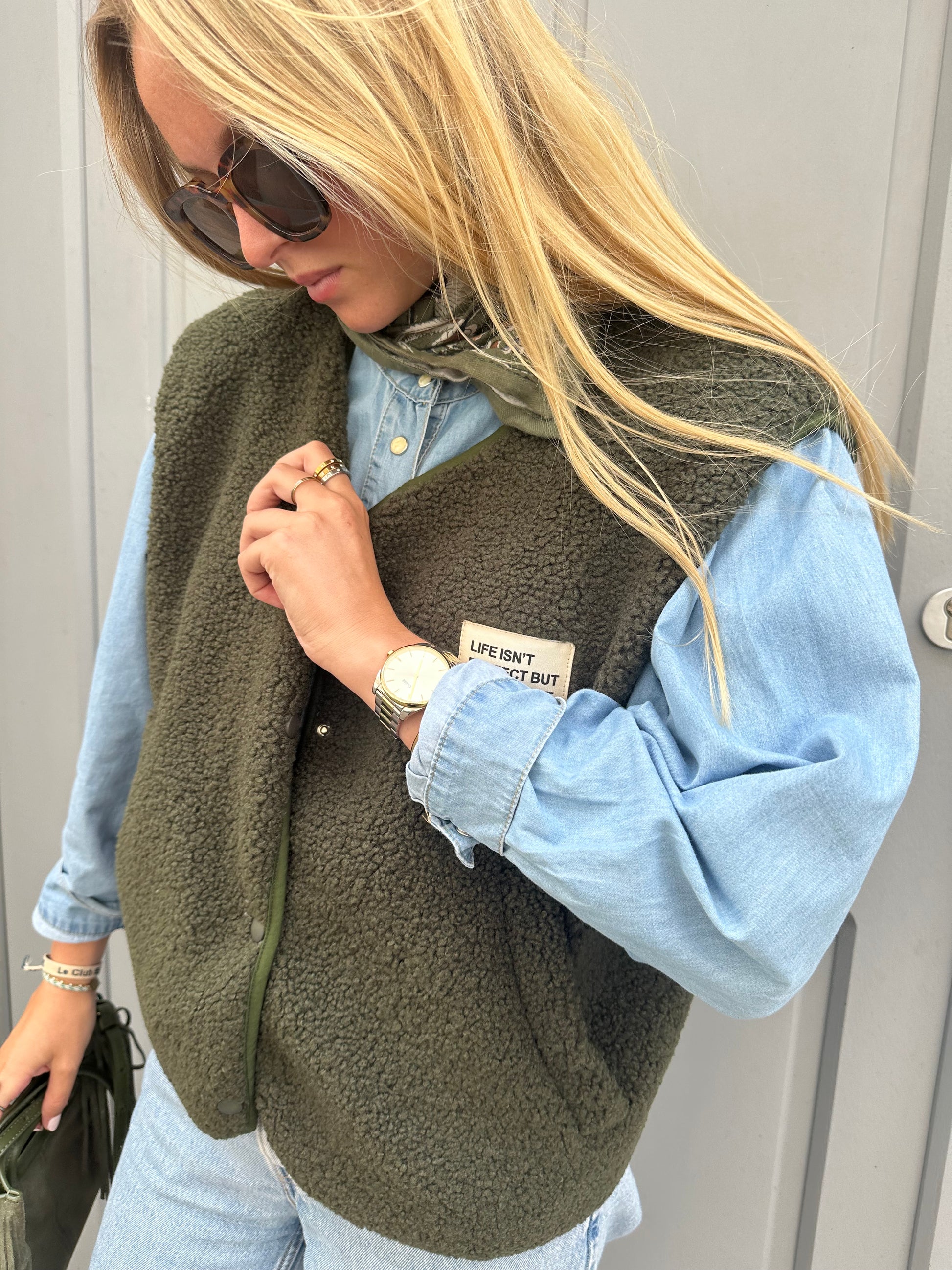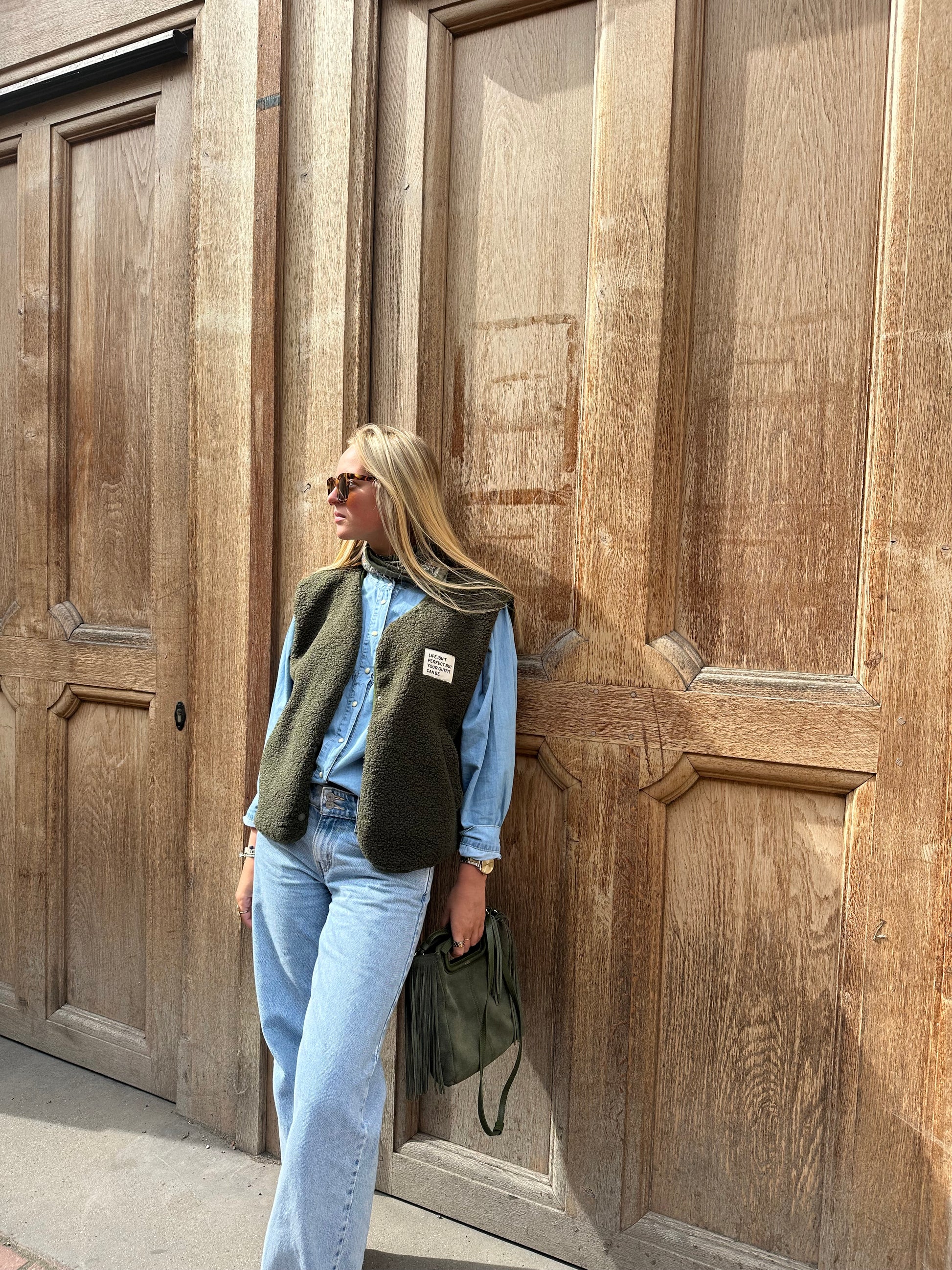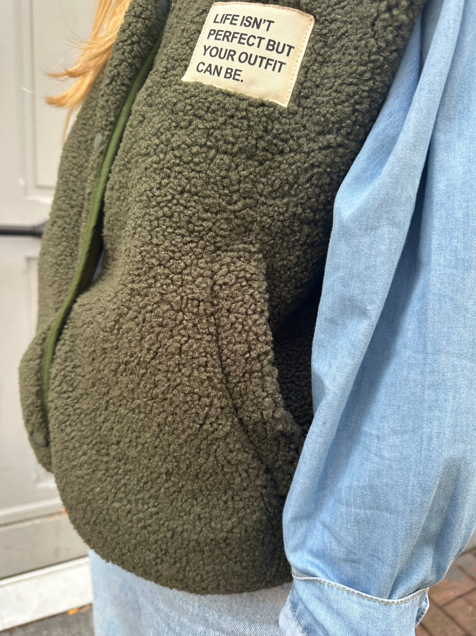 Adoptez notre gilet Gaby sans manches moumoute en coloris kaki avec patch inscription sur le devant. Pour un look confort, chaleur et ultra tendance.